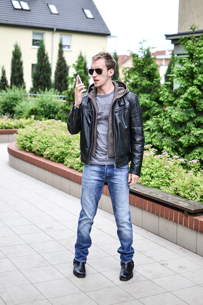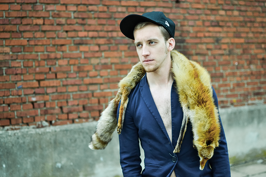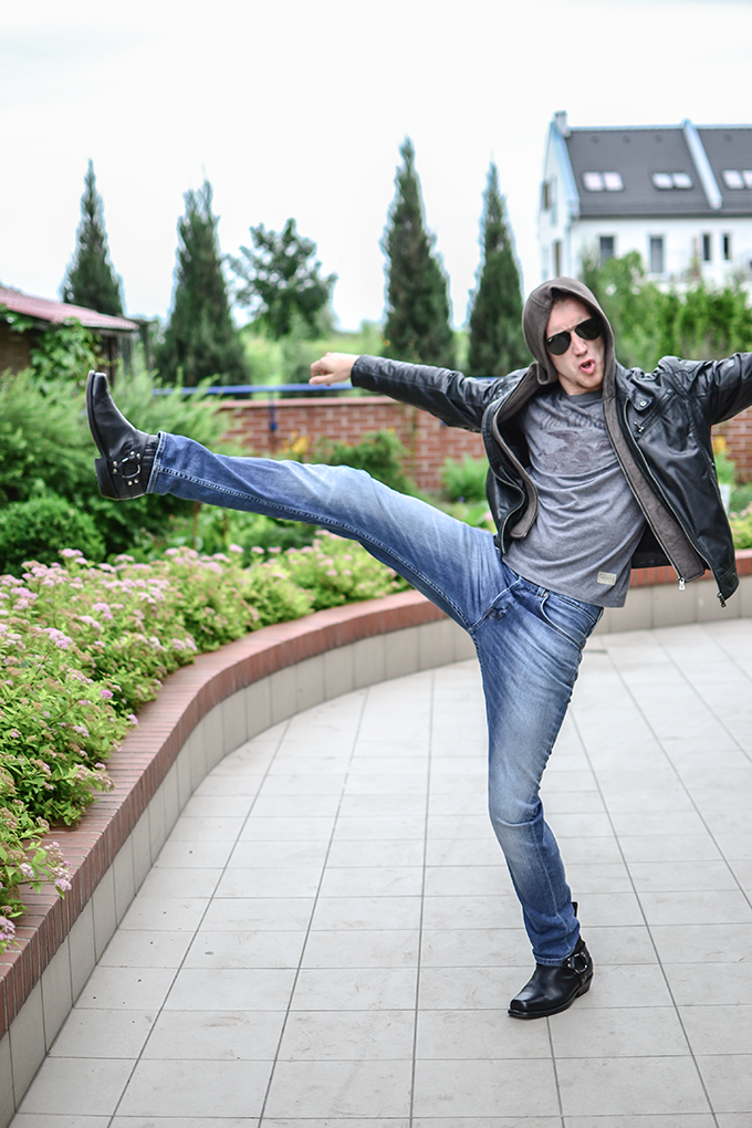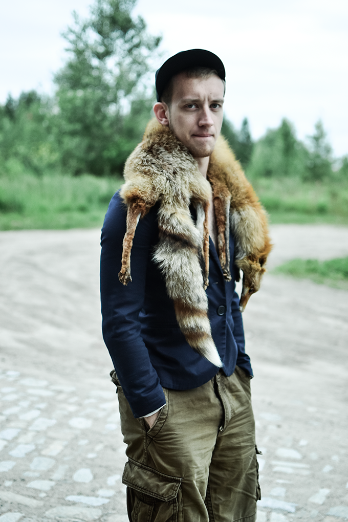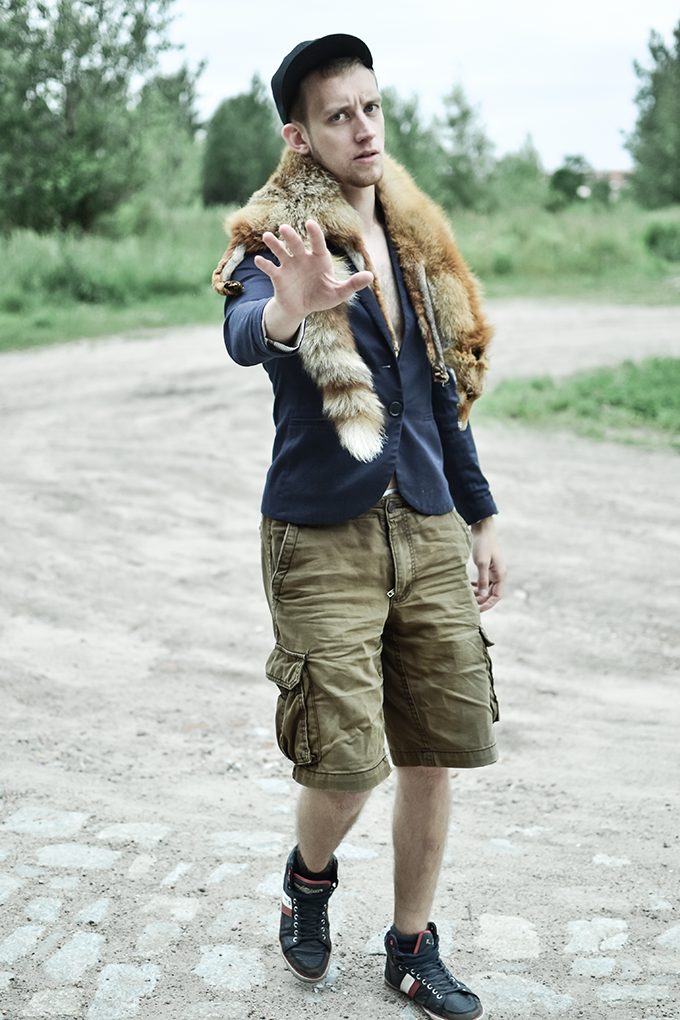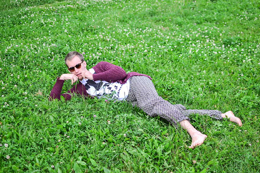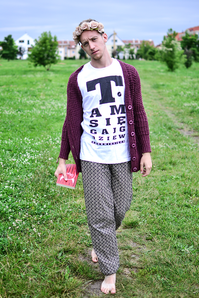 Czyli, tak się wożę, kiedy przyjeżdżają do mnie goście. Mama zawsze mi powtarzała – „synu, jesteś wyjątkowy”, a mamy się przecież nie mylą. Poczucie stylu kupiłem na Dworcu Zachodnim, kolejne jego części dostałem w Pałacu Kultury oraz na jednej z wycieczek do Słowacji. Obiecuję, tak się będę nosił kiedy przyjedzie do mnie Justyna Sekuła i Magdalena Stępień. Tak siedząc w trawie, popijając herbatę z drogiej zastawy, będę im deklamował piękne rzeczy. Ta wniebowzięta rozmarzona stylizacja jest sponsorowana przez moją dobrą znajomą z LO, która właśnie powoli startuje z nowym faszonowym, w sensie koszulkowym biznesem – Farsa – dzieje się dobro. Od niej dostałem t-shirt, buziaki, przytulenia, objęcia, westchnienia – nie mogłem o tym nie wspomnieć.